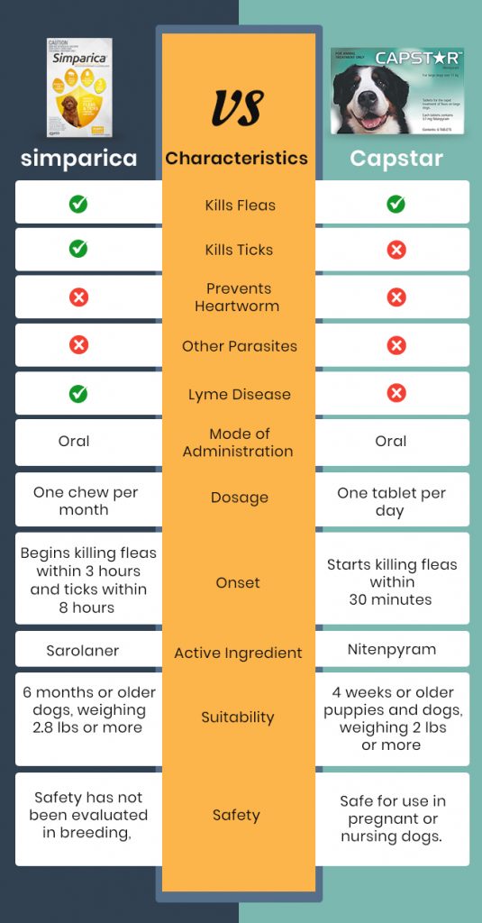 Let’s have a look at the comparison of the characteristics of Simparica and Capstar with the following comparison table: